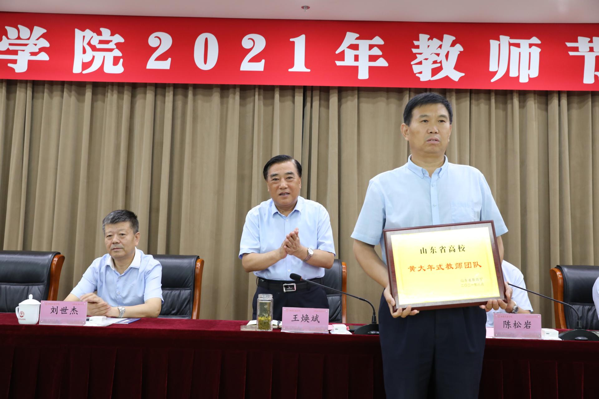 学校党委领导班子成员为高校教龄满30年教师、第二批“山东省高校黄大年式教师团队”、2021年师德标兵、优秀教师、优秀教育工作者代表颁发了奖牌和荣誉证书。