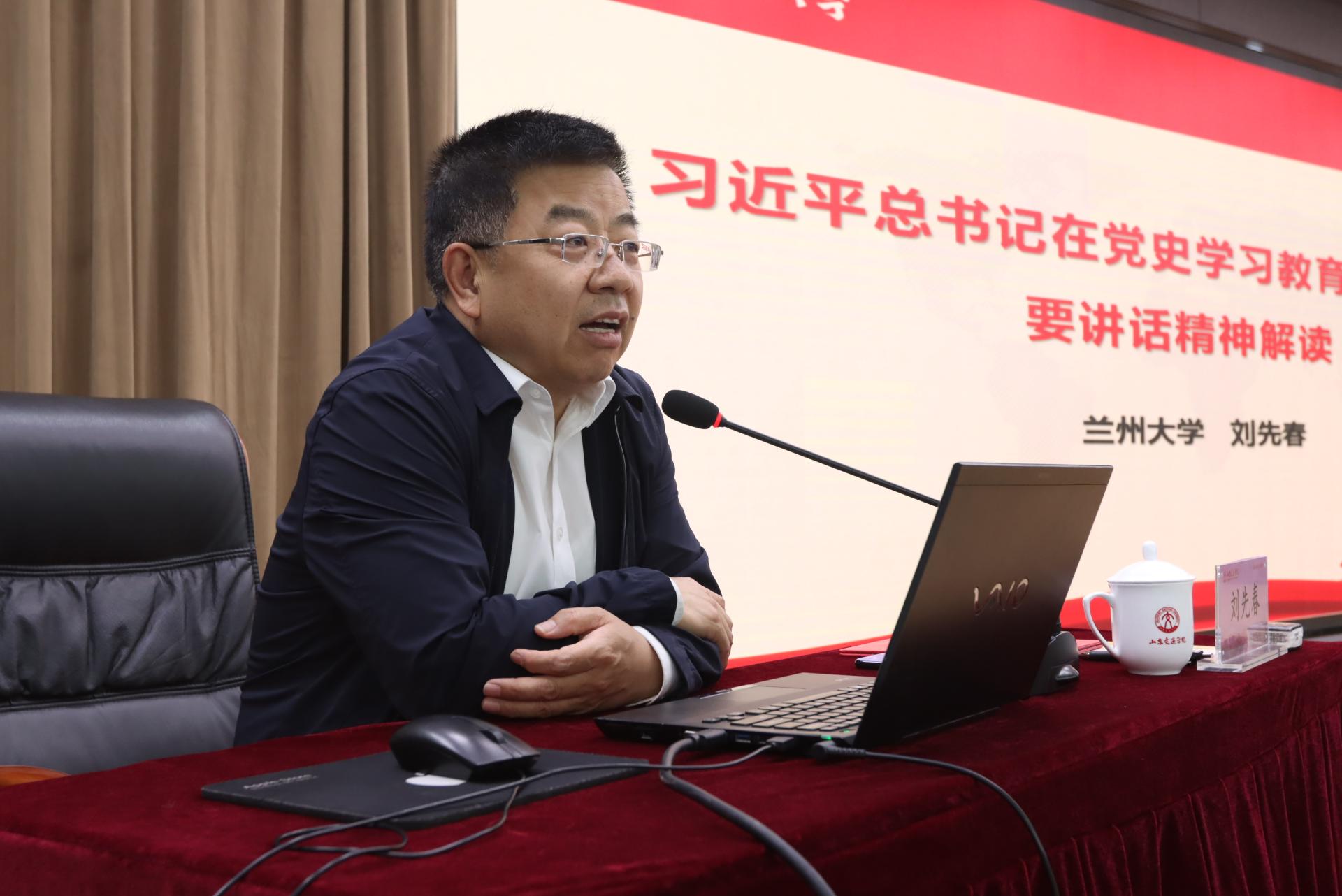 5月8日下午,甘肃省社科联副主席、兰州大学马克思主义学院教授刘先春,在长清校区明德楼101报告厅以《习近平总书记在党史学习教育动员大会重要讲话精神解读》为题作专题宣讲。学校党委书记王焕斌,党委副书记李贞涛,党委委员王晨晖、周颜玲出席讲座。讲座由李贞涛主持。