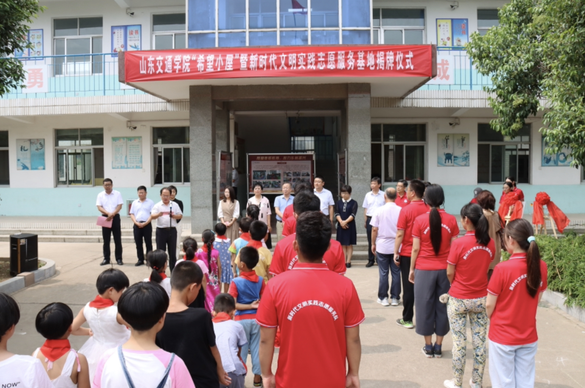 7月29日下午,学校在长清区万德街道店台村小学举行“希望小屋”暨新时代文明实践志愿服务基地揭牌仪式。我校党委副书记唐勇,长清区人大副主任时华勤,中交路建华北工程有限公司团委书记、党委组织部副部长、人力部副经理刘小惠,共青团济南市委副书记孔庆松,长清区万德街道党工委书记张儒涛,共青团长清区委书记焦玉燕,万德街道党工委副书记、政协联络室主任刘绍文出席活动。