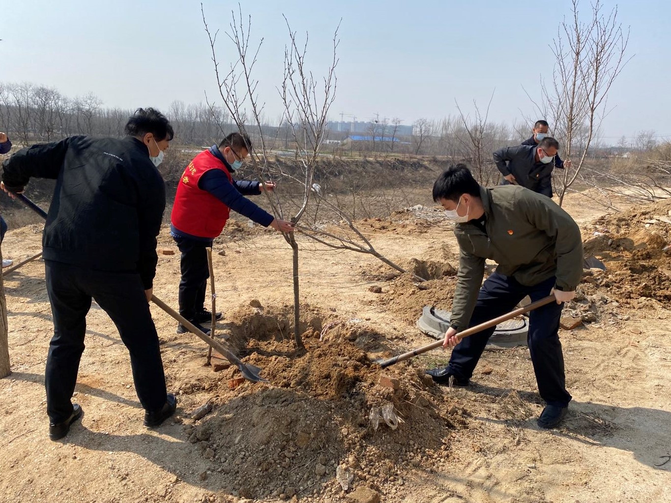 成立仪式后,服务队成员分成三组,其中两组下沉到社区各个岗位开展工作,另一组成员走进北郭格村的乡间地头了解春播春耕情况,并开展植树活动,美化乡村环境。