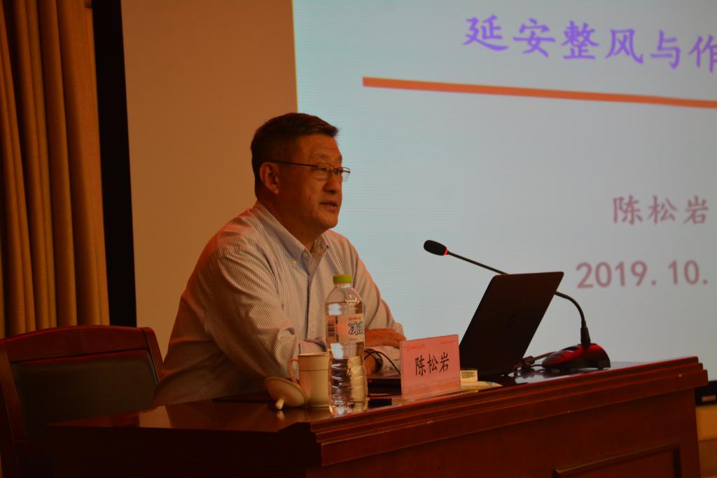 陈松岩以《延安整风与作风建设》为题,介绍了延安整风运动的背景及原因,深入剖析了延安整风运动中反对主观主义以整顿学风、反对宗派主义以整顿党风、反对党八股以整顿文风等主要内容。他根据延安整风运动的进程、方针、方法效果、精神等内容,结合近期在学校基层调研的情况,分析了机关在作风方面存在的问题。他指出,当前机关中的形式主义、官僚主义还没有彻底根除,不担当、不作为现象时有发生。他要求,全体机关党员要不忘初心和使命,强化政治担当,凝心聚力、干事创业;改进工作作风,提高服务水平和师生满意度;强化目标意识,提升工作质量和效率。
