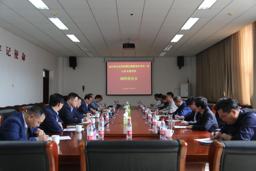 孔祥云对调研组的来访表示欢迎,并介绍了学校的基本情况。他感谢服务队对我校挂职干部的培养,并表示今后将会加强交流,充分发挥高校人才优势,为服务队提供智力支撑,进一步推动校地合作、校企合作。付俊海感谢学校的热情接待,高度评价了学校对服务队工作的支持和我校挂职干部的工作表现,对学校蒸蒸日上的发展势头表示欣慰,并祝愿学校早日更名成功。他指出,服务队进驻枣庄以后,大家群策群力,工作取得了初步成绩,得到了省委组织部的认可,但也存在一些工作瓶颈。他希望,学校的专家教授能作为企业顾问,为企业问诊把脉;“4+5+1”民企高端对话会能得到学校的大力支持。随后,双方就高端对话会、科技成果转化、联合申报科研项目等方面进行了深入探讨。