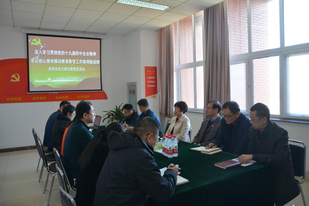 孙秀丽对教务处近年来在教育教学工作中取得的成绩表示肯定。她要求,教务处党员干部要按照学校党委要求自觉抓好学习,提高认识,结合工作实际将党的十九届四中全会精神落细落实,落地生根。她强调,抓好教学工作、提高教学质量是高校永恒的课题,教务处作为联系师生最密切的职能部门之一,党员干部更要担当作为,做到工作有分量、有影响。她勉励全体党员要坚持教学为本的初心,牢记为师生服务的使命,齐心协力,为教育事业和学校发展做出更大的贡献。