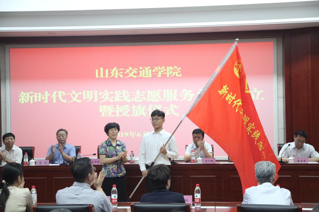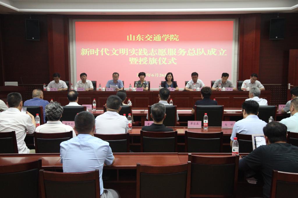 在我校省级文明校园创建不断掀起工作热潮之际,为进一步激发全校师生参与志愿服务的热情,大力提升志愿服务质量,全面助力新时代精神文明建设,6月26日下午,我校联合济南市新时代文明实践中心在长清校区工程中心H401举办了山东交通学院新时代文明实践志愿服务总队成立暨授旗仪式。这是我省高校中率先成立的新时代文明实践志愿服务总队,在全国高校中也是第一个,走在了全国高校的前列。党委书记孙秀丽,党委副书记唐勇,济南市委宣传部副部长曹湧,济南市长清区委常委、宣传部长曲京鹏出席会议,会议由党委副书记唐勇主持。