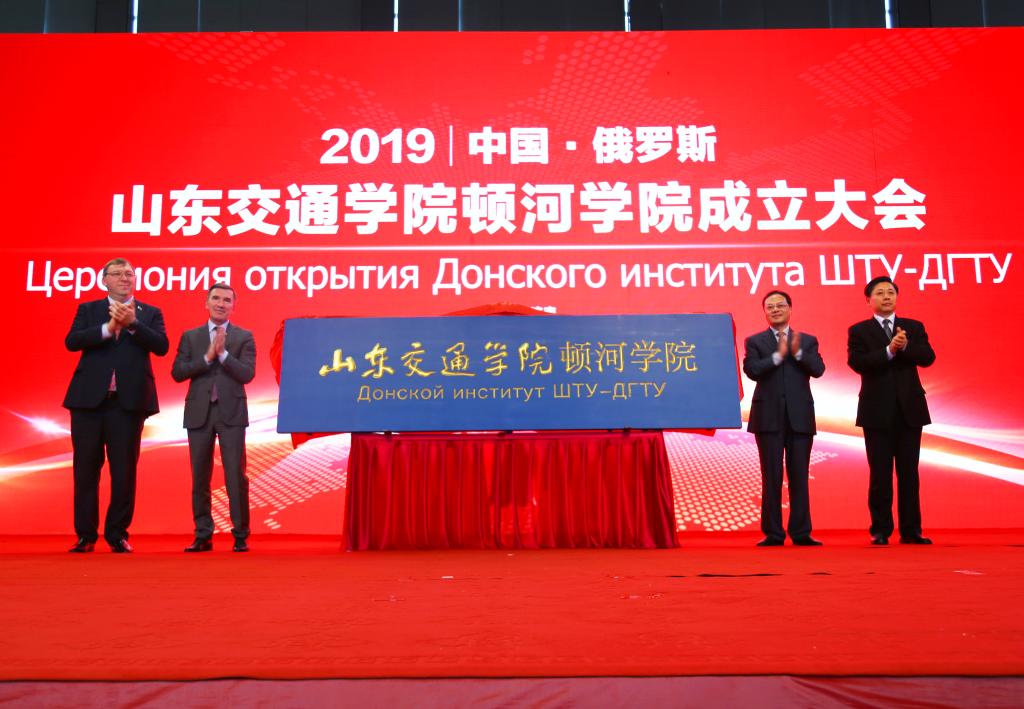 随后,于杰、王艺华;伊辛科、古西科夫为山东交通学院顿河学院揭牌。