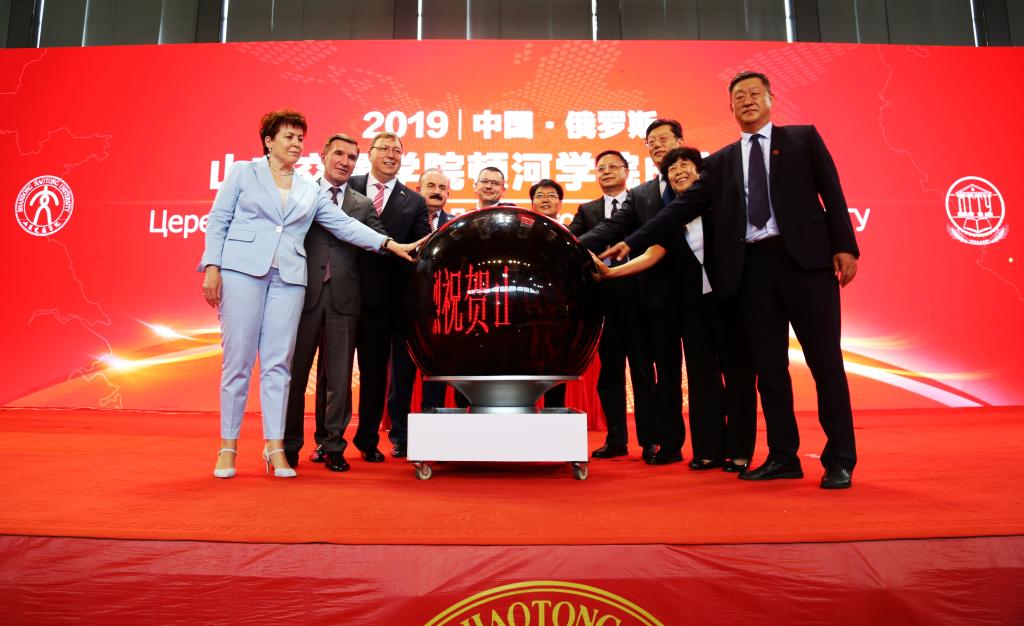 邓云锋、刘福臣、李永森、孙秀丽、陈松岩;伊辛科、古西科夫、波兹尼亚科夫、科茹霍娃、梅什西共同启动开启象征山东交通学院顿河学院成立的水晶球。