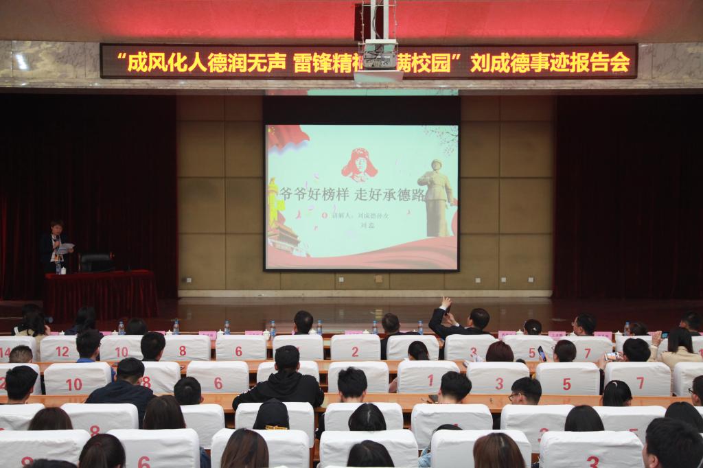 事迹报告会上,济南学雷锋志愿者、长清百姓宣讲团成员、刘成德孙女,现就读于山东师范大学新闻与传媒学院的刘蕊作题为《爷爷好榜样,走好成德路》报告。济南市长清区学习贯彻党的十九大精神宣讲团成员、长清区委党校讲师赵珊作《刘成德精神及其时代价值》报告。省级文明校园创建办公室副主任、学校妇委会主任、马克思主义学院党总支书记闫荣双主持事迹报告会。她说,在刘成德老人的影响和带动下,一批又一批的后来者,一定会沿着他的路径,踏着他的足迹,成为雷锋精神的接班人,共同将学习雷锋的旗帜高高举起,让新时代文明风尚洒满校园每一个角落。