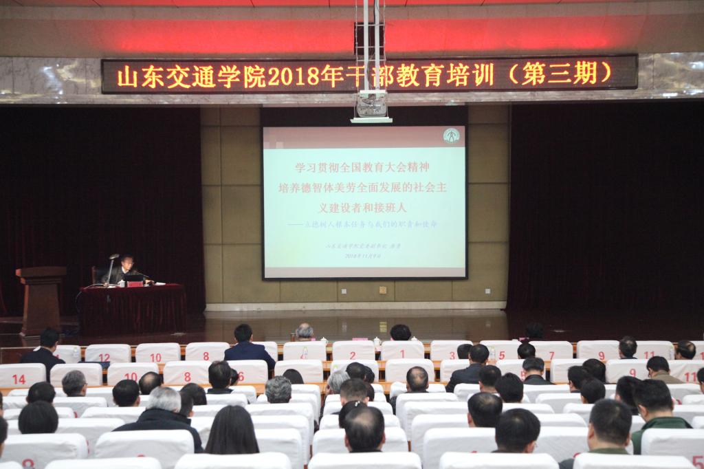 11月9日下午,学校党委举办2018年第三期中层干部专题培训报告会。学校领导孙秀丽、唐勇、徐晓红、孙云早出席了报告会,学校中层以上干部聆听了报告,威海校区相关人员通过视频连线听取报告。报告会由党委组织部部长宋光军主持。