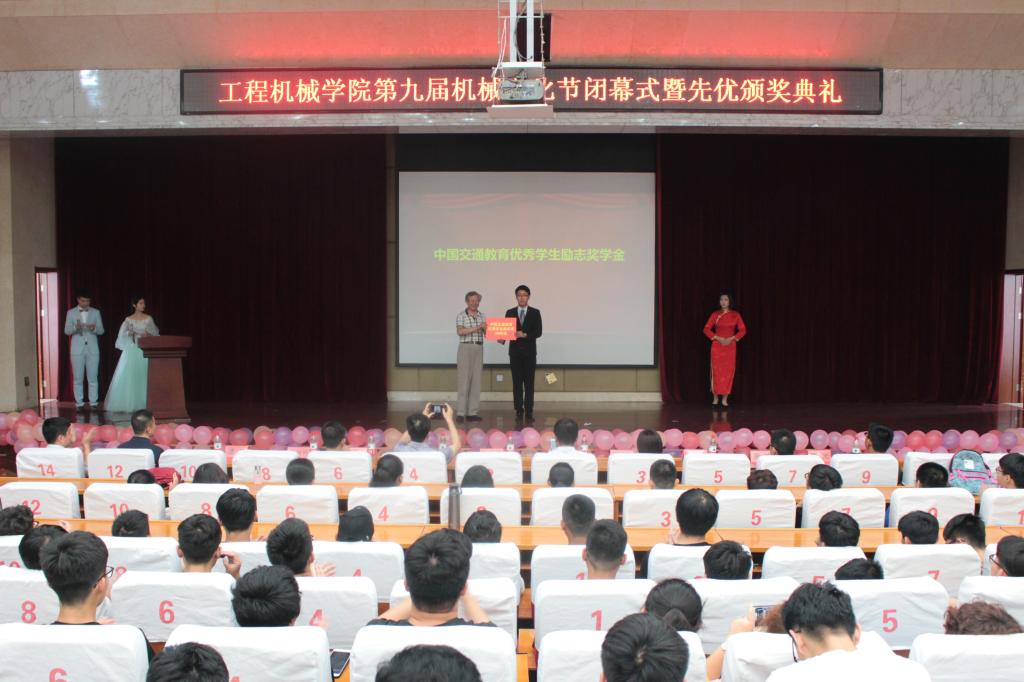 颁奖典礼上,孙云早为机械文化节闭幕式致辞。他希望,同学们胸怀祖国,放眼世界;珍惜时光、刻苦学习、早日成材;关注自身在20岁、40岁、55岁所处的时代和形势,努力成为世界交通各个领域中的领袖和领军人物。随后,为“中国交通教育优秀学生励志奖”获得者、工程机械学院机械143班徐涛同学颁奖。典礼结束后,工程机械学院举行了体现机械文化节成果的精彩文艺汇演,充分展现了当代大学生昂扬向上,奋发进取的精神风貌,诠释了科技、人文、创新、实践的新梦想。