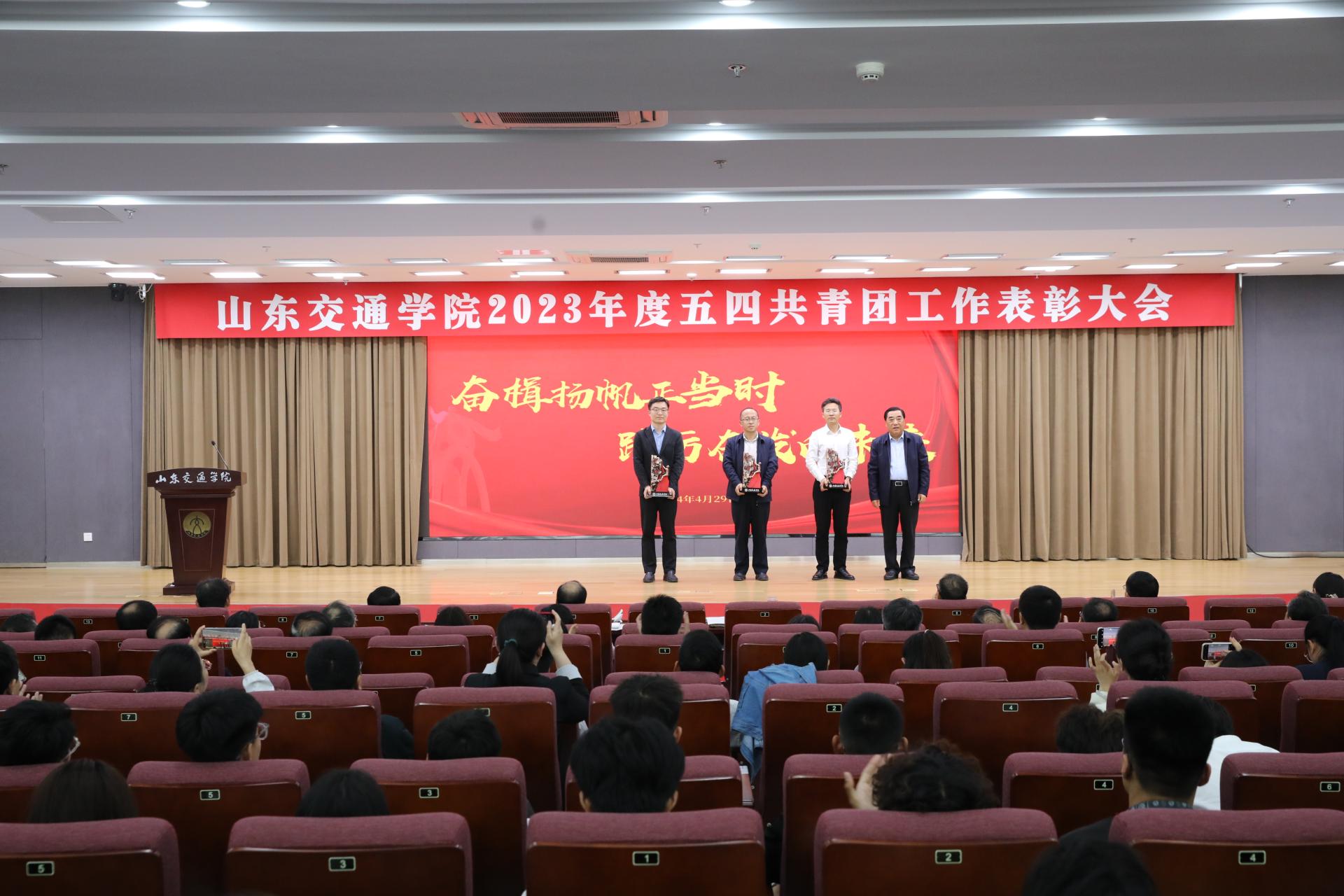 与会领导为2023年度优秀共青团员、优秀共青团干部、优秀共青团员标兵获得者代表,创新创业竞赛标志性成果获得者代表,先进团支部、红旗团支部、共青团模范工作者、红旗团委、高水平学术科技和创新创业“登峰杯”获奖学院依次颁奖。