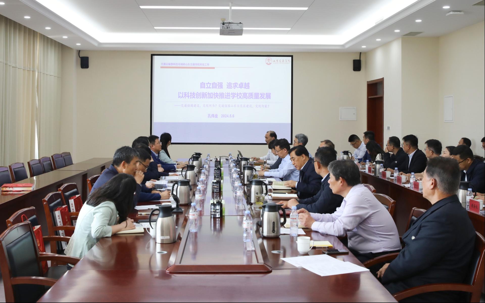 交通运输部科技司综合处、科技创新发展处、山东省交通运输厅科教处、国家重点研发计划重点专项管理专班负责人;学校国家级人才代表,相关职能部门、二级学院负责人参加调研座谈。