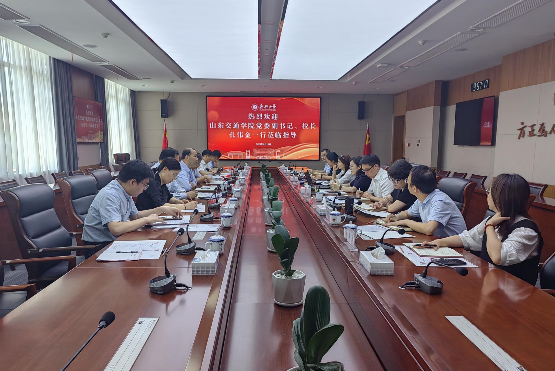 在嘉兴大学,嘉兴大学党委委员、副校长(主持日常工作)张琦对孔伟金一行的到来表示欢迎,陪同我校调研组实地调研了G60科创走廊产业与创新研究院、红船精神育人成果展示馆并进行交流座谈。张琦介绍了嘉兴大学的办学历史、办学特色和发展现状,分享了学校聚焦更名大学目标在学科建设、人才培养、社会服务等方面的成功举措、经验做法和主要成绩。孔伟金对嘉兴大学近年来取得的办学成绩以及在红船精神育人、应用型办学等方面的做法和经验给予了高度评价,介绍了山东交通学院围绕“1167”工作布局融入交通强国战略实施特色发展的工作举措,并希望两校在人才培养、师资队伍建设、学科建设等方面加强合作交流,共谋高质量发展。