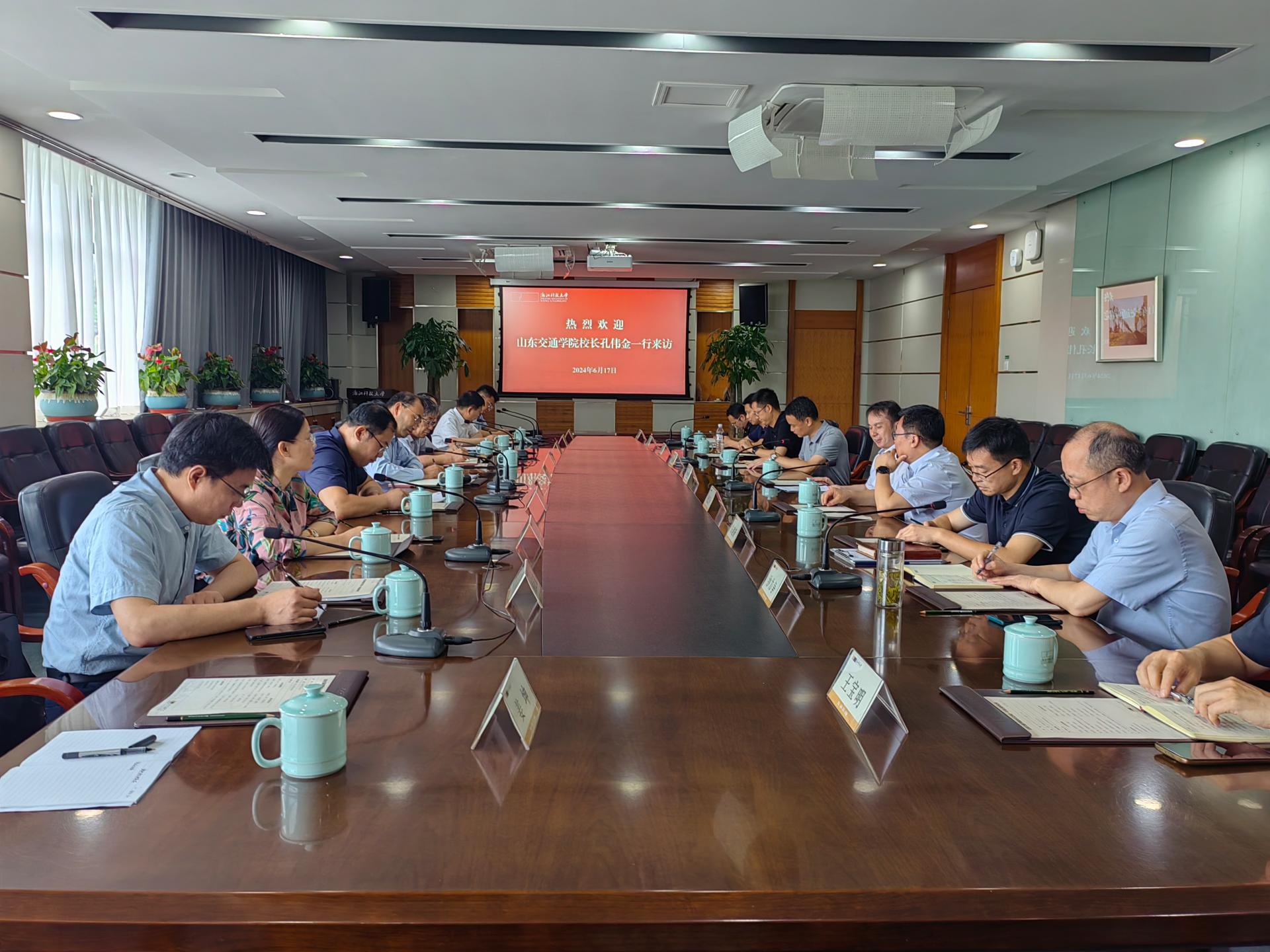 在浙江科技大学,浙江科技大学党委副书记、校长陈建孟,党委委员、副校长侯北平出席座谈交流会。陈建孟对我校调研组的到来表示热烈欢迎,并介绍了浙江科技大学近年来的办学情况。侯北平介绍了浙江科技大学立足更名新方位,聚焦高水平科技大学建设取得的主要成绩。孔伟金介绍了山东交通学院第三次党代会提出的战略发展目标和重点举措,并希望今后与浙江科技大学加强交流、互利合作,共同提升应用创新人才培养能力、科技创新及成果转化应用能力。浙江科技大学相关职能部门负责人就更名大学之路、高层次人才引育、高水平标志性成果产出、校院二级管理等方面进行了经验分享。会后孔伟金、王保群一行参观了浙江科技大学中德合作馆。