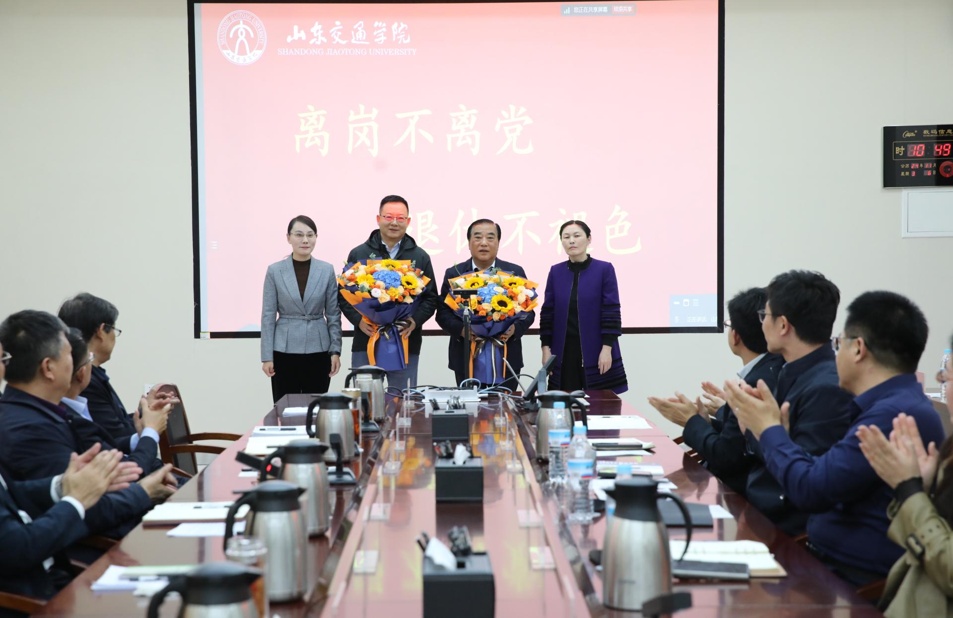 座谈会上,与会代表向王焕斌、曲同军献花。与会人员纷纷为两位领导送上祝福,希望他们离岗不离党、退休不褪色,继续为学校建设发展建言献策、贡献才智。