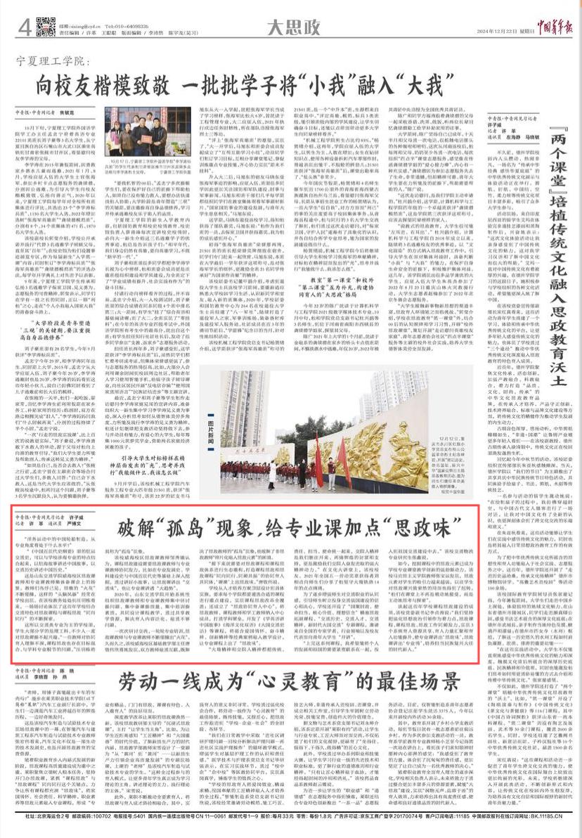 新闻网讯 2024年是思想政治教育学科设立40年,马克思主义理论研究和建设工程实施20年。近年来,学校党委坚持以习近平新时代中国特色社会主义思想为指导,落实立德树人根本任务,构建形成交通特色思想政治工作体系。12月22日,中国青年报04版“大思政”版面,报道学校立足交通特色,坚持把强化思想政治引领作为着力点,思政课程、课程思政、思政工作同频发力,培养时代新人的实践探索。