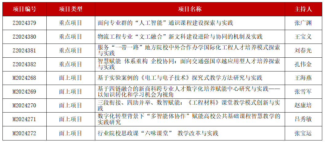 本次立项的9个项目主要聚焦卓越交通应用型人才培养探索与实践、中外合作办学国际化工程人才培养模式探索与实践、课程建设、课堂教学研究与创新、教学模式和教学方法改革等当前高等教育改革发展的热点难点问题。另外,除我校主持立项项目外,与山东大学、山东师范大学等高校合作的5个项目同时获批立项,其中重点项目4项、面上项目1项。