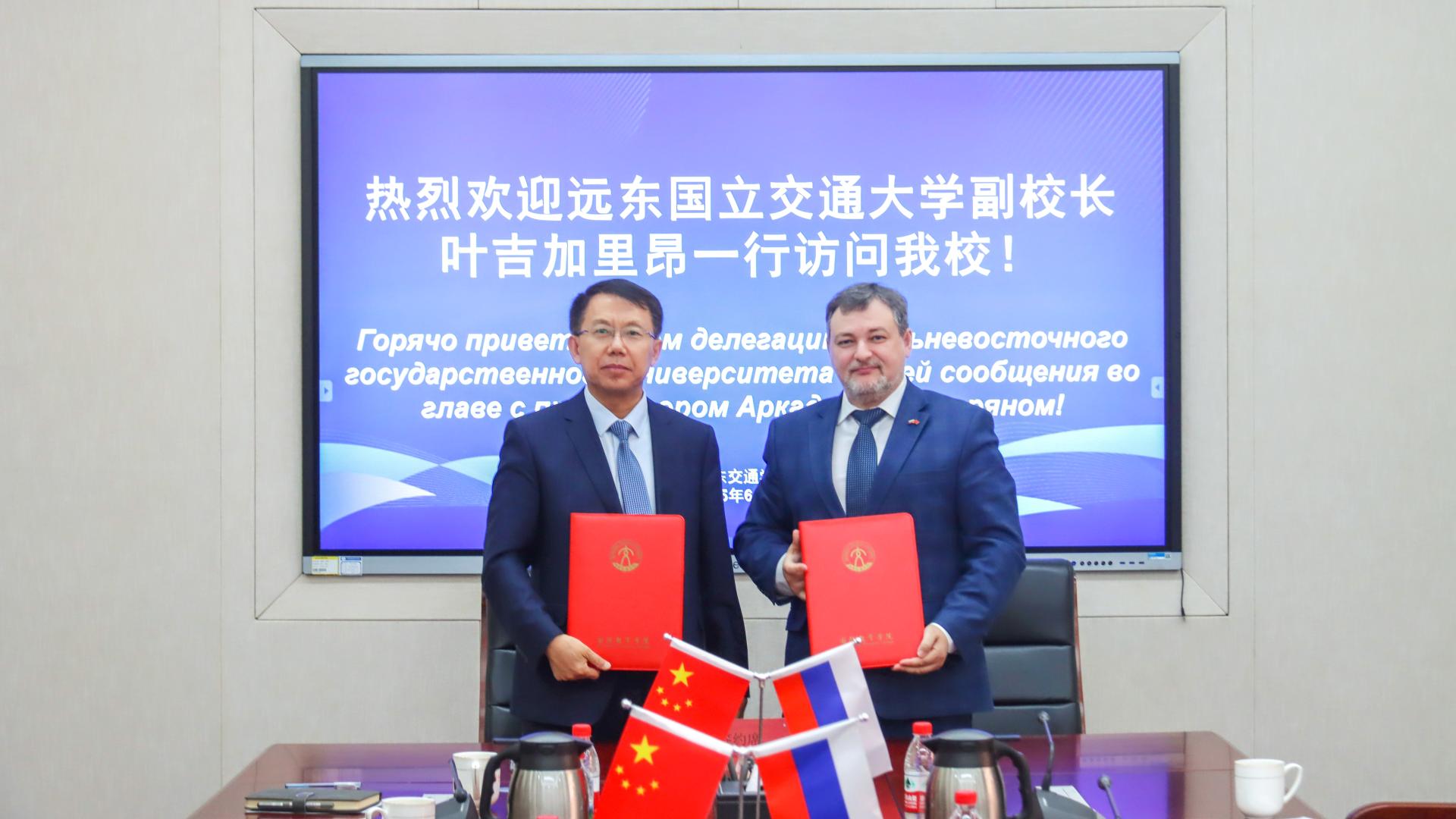姜华平与叶季加里扬·阿尔卡季·鲁道夫维奇签署《山东交通学院与远东国立交通大学联合培养项目协议书》,启动“新技术应用”国际教育项目,开展国际学生联合培养。两校分别介绍了各自学校科研工作情况。