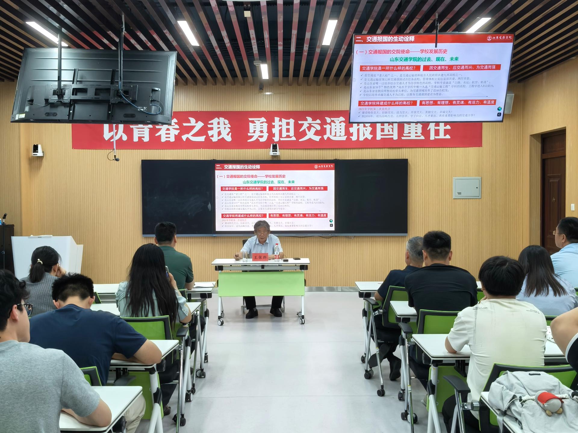 学校党委委员、副院长王保群以《交通报国 强国有我——践行交通人的初心与使命》为题,为航空学院、轨道交通学院青年学生讲授思政课。他以京沪高速铁路、港珠澳大桥、三峡水电站、上海港等大国工程建设成就为证,讲述一代代交通人将个人奋斗融入国家发展洪流的赤诚担当。他指出“爱校 敬业 务实 创新”的交院人精神是交通报国情怀最深刻、最动人的注脚,同学们要以优秀校友为榜样,在学习中夯实专业基础,在实践中锻炼创新能力,勇做交通强国建设的时代先锋。