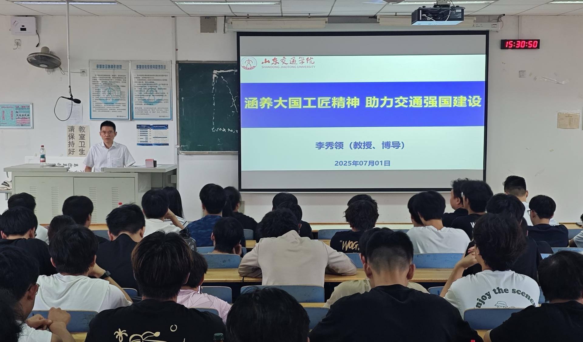 学校党委委员、副院长李秀领以《涵养大国工匠精神 助力交通强国建设》为题,为交通土建工程学院土木工程专业学生讲授思政课。他从学校发展概况、土木行业典型工程、机遇挑战、技术前沿等方面,详细阐述了我国交通土建行业高质量发展趋势、国家政策和主要驱动力。他指出,交通土建工程正在向绿色化、智能化、信息化等新兴交叉领域发展,助推“建造大国”走向“建造强国”。他寄语同学们要牢记初心使命,保持朝气,将个人理想熔铸于交通强国的时代使命,为交通强国建设贡献青春力量。