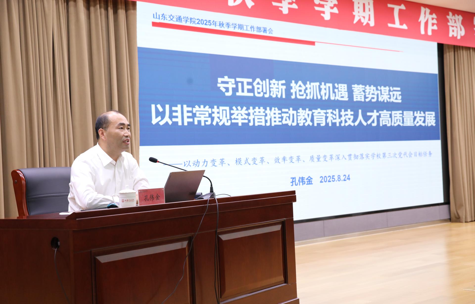学校党委副书记、院长孔伟金就上半年工作作总结,并部署新学期主要工作。他以《守正创新 抢抓机遇 蓄势谋远 以非常规举措推动教育科技人才高质量发展》为题,从进展与成绩、方位与形势、目标与任务三个方面系统总结回顾了上半年和暑期主要工作,全面剖析了当前形势,进一步明确了推动学校高质量发展的各项措施,并对2025年下半年重点任务进行规划部署。他强调,全校上下要紧紧围绕高水平大学建设目标,扎实推进卓越交通人才培养、科技创新、人才引育、“十五五”发展规划编制与学科学位点建设等各项重点工作,发扬“逢山开路、遇水架桥”的交通人精神,抢抓机遇、勇于担当、追求卓越,奋力书写学校高质量发展的崭新篇章。