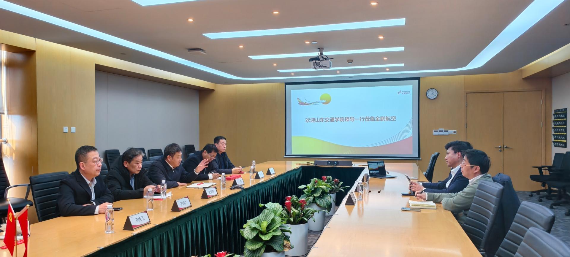 在金鹏航空公司,王伟一行参观了AOC运行控制中心,并与金鹏航空副总裁高海龙等进行座谈。王伟高度评价了学校与金鹏航空在人才培养方面取得的合作成果,希望双方下一步能聚焦国产大飞机运维领域,深化产学研协同,在共育人才、联合科研、实习就业等方面聚力突破、携手共进。高海龙详细介绍了金鹏航空的发展情况以及引进60架国产大飞机C919后的发展战略,提出了与我校进行国产大飞机运维专业合作的愿望。王保群简要介绍了学校基本情况和学科专业发展取得的新成效,重点推介了最新科研成果与合作方向。